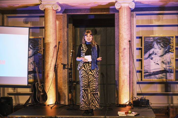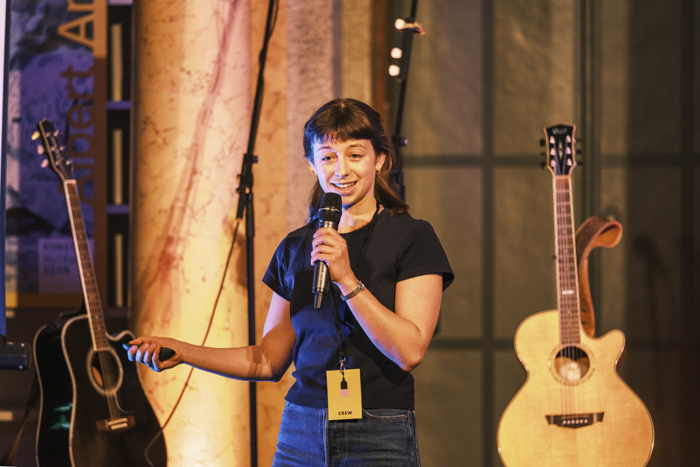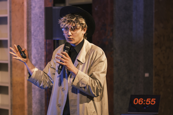 Den ersten Slam eröffnete Simona Procacci. Der Schultheissensaal ist für Simona ein vertrauter Ort: Hier schrieb sie ihre Bachelorarbeit und bereitete sich auf Prüfungen vor. Mit einem Augenzwinkern erzählt sie, dass sie einmal nicht für eine Kernphysikprüfung gelernt hatte und von ihren Mitstudierenden aufgezogen wurde, als sie eine Banane auspackte, die angeblich radioaktiv sei.