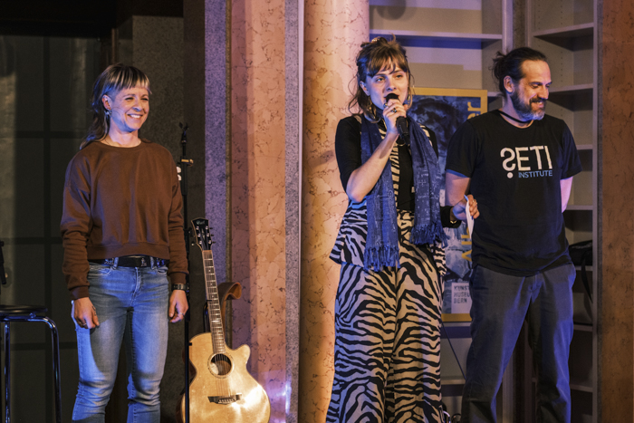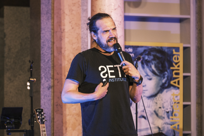 Daniel Angerhausen startete das zweite Slam-Duell. Daniel nahm in seinem Slam «KI sucht ET … auf dem Mond» das Publikum mit in die Forschung zur Suche nach Technosignaturen, also technologischen Spuren im Weltall, oder in seinen Worten: die Suche nach extraterrestrischer Intelligenz (SETI). Er wies darauf hin, dass die erste Aluminiumfahne auf dem Mond, eines der ersten Experimente der Apollo-Mission, in Bern gebaut und sogar vor der amerikanischen Flagge aufgestellt wurde.