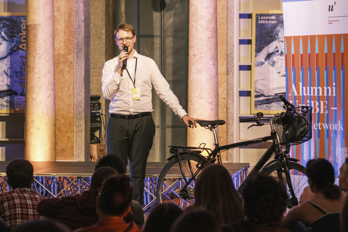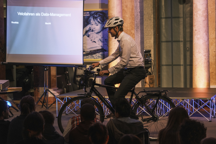 Veranschaulicht wurde dies anhand der Frage, ob man mit dem Fahrrad eine Runde durch eine Bibliothek drehen darf. Er brachte sein Fahrrad mit und drehte damit eine Runde auf der Bühne.